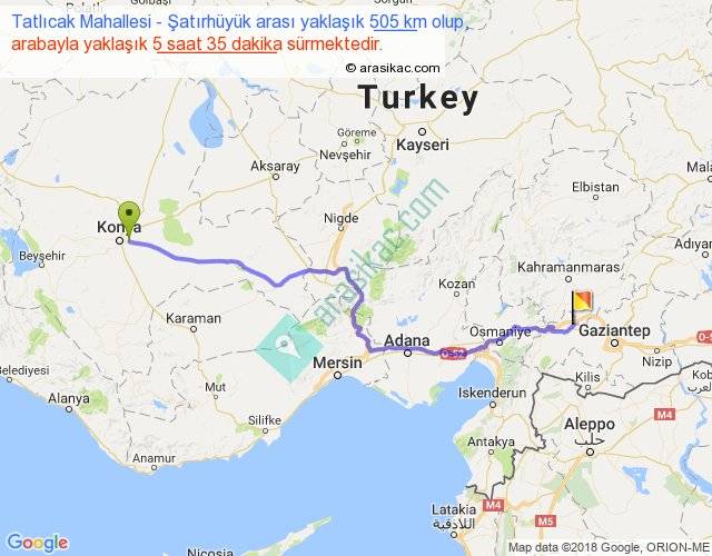 Tatlıcak Mahallesi - Şatırhüyük arası yaklaşık olarak 90 km/h ile yukarıda belirtilen sürede olup, iki yerin kuş uçuşu uzaklığı (mesafesi) 391'dir. Eğer belirtilen yerler arasında uçak seferi var ise bu süre uçakla 36 dakika'ya kadar düşebilir. Yolculuk otobüsle 7 saat 15 dakika sürmektedir.