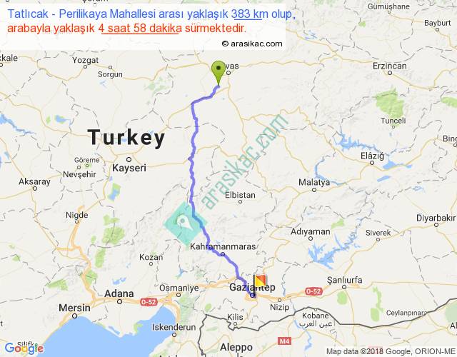 Tatlıcak - Perilikaya Mahallesi arası yaklaşık olarak 90 km/h ile yukarıda belirtilen sürede olup, iki yerin kuş uçuşu uzaklığı (mesafesi) 285'dir. Eğer belirtilen yerler arasında uçak seferi var ise bu süre uçakla 26 dakika'ya kadar düşebilir. Yolculuk otobüsle 6 saat 27 dakika sürmektedir.