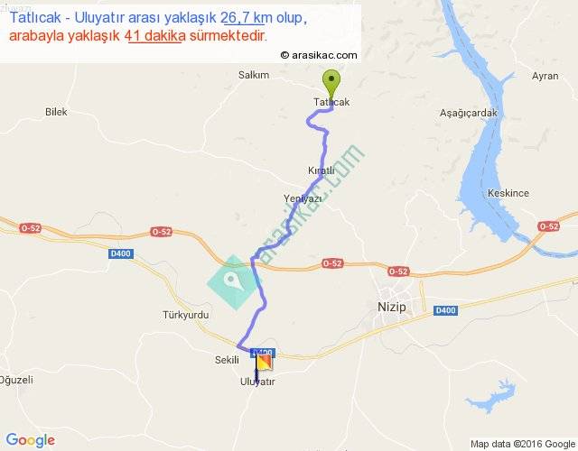 Tatlıcak - Uluyatır arası yaklaşık olarak 90 km/h ile yukarıda belirtilen sürede olup, iki yerin kuş uçuşu uzaklığı (mesafesi) 19'dir. Yolculuk otobüsle 53 dakika sürmektedir.
