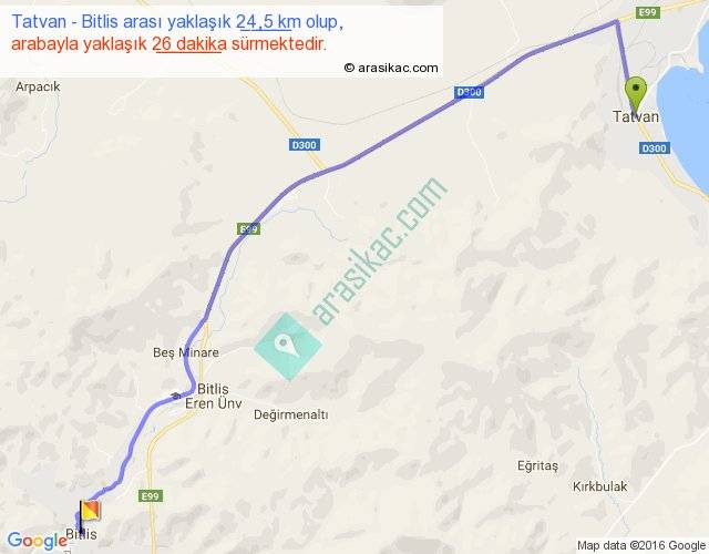 Tatvan - Bitlis arası yaklaşık olarak 90 km/h ile yukarıda belirtilen sürede olup, iki yerin kuş uçuşu uzaklığı (mesafesi) 19'dir. Yolculuk otobüsle 33 dakika sürmektedir.
