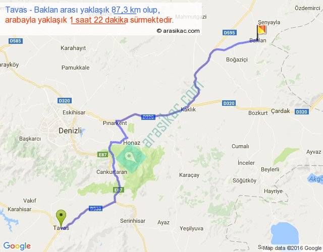 Tavas - Baklan arası yaklaşık olarak 90 km/h ile yukarıda belirtilen sürede olup, iki yerin kuş uçuşu uzaklığı (mesafesi) 65'dir. Yolculuk otobüsle 1 saat 46 dakika sürmektedir.