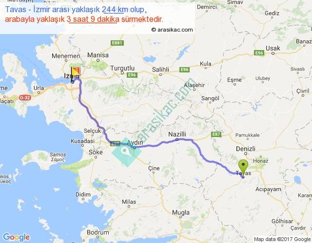 Tavas - İzmir arası yaklaşık olarak 90 km/h ile yukarıda belirtilen sürede olup, iki yerin kuş uçuşu uzaklığı (mesafesi) 193'dir. Yolculuk otobüsle 4 saat 5 dakika sürmektedir.