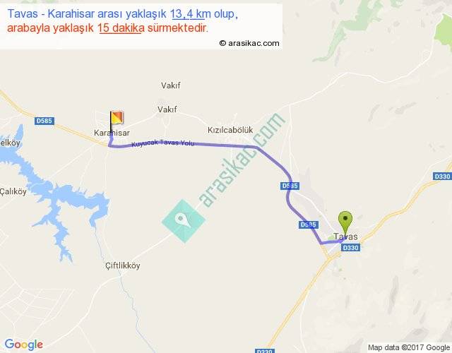 Tavas - Karahisar arası yaklaşık olarak 90 km/h ile yukarıda belirtilen sürede olup, iki yerin kuş uçuşu uzaklığı (mesafesi) 11'dir. Yolculuk otobüsle 19 dakika sürmektedir.