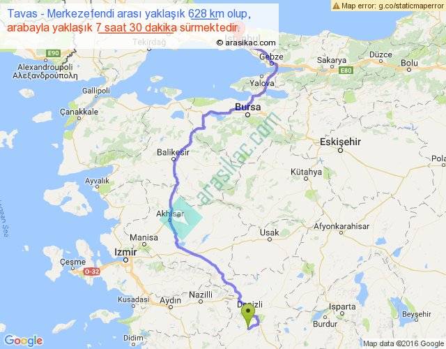 Tavas - Merkezefendi arası yaklaşık olarak 90 km/h ile yukarıda belirtilen sürede olup, iki yerin kuş uçuşu uzaklığı (mesafesi) 381'dir. Eğer belirtilen yerler arasında uçak seferi var ise bu süre uçakla 35 dakika'ya kadar düşebilir. Yolculuk otobüsle 9 saat 45 dakika sürmektedir.