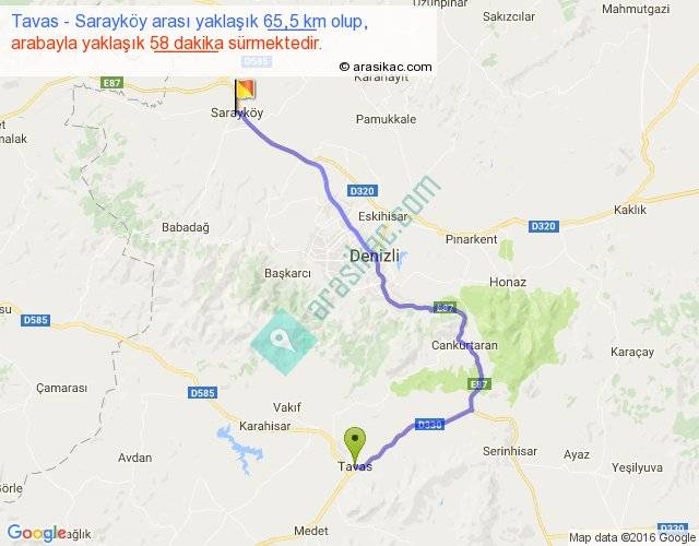 Tavas - Sarayköy arası yaklaşık olarak 90 km/h ile yukarıda belirtilen sürede olup, iki yerin kuş uçuşu uzaklığı (mesafesi) 41'dir. Yolculuk otobüsle 1 saat 15 dakika sürmektedir.