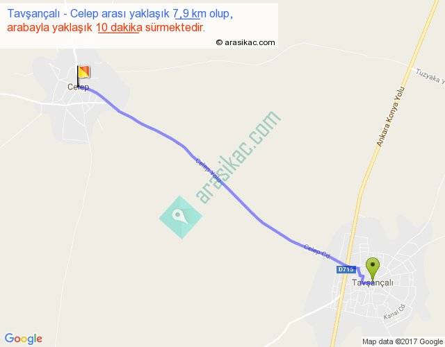 Tavşançalı - Celep arası yaklaşık olarak 90 km/h ile yukarıda belirtilen sürede olup, iki yerin kuş uçuşu uzaklığı (mesafesi) 8'dir. Yolculuk otobüsle 13 dakika sürmektedir.