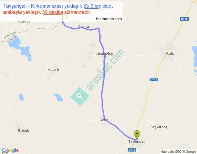 Tavşançalı - Kırkpınar arası yaklaşık olarak 90 km/h ile yukarıda belirtilen sürede olup, iki yerin kuş uçuşu uzaklığı (mesafesi) 27'dir. Yolculuk otobüsle 50 dakika sürmektedir.