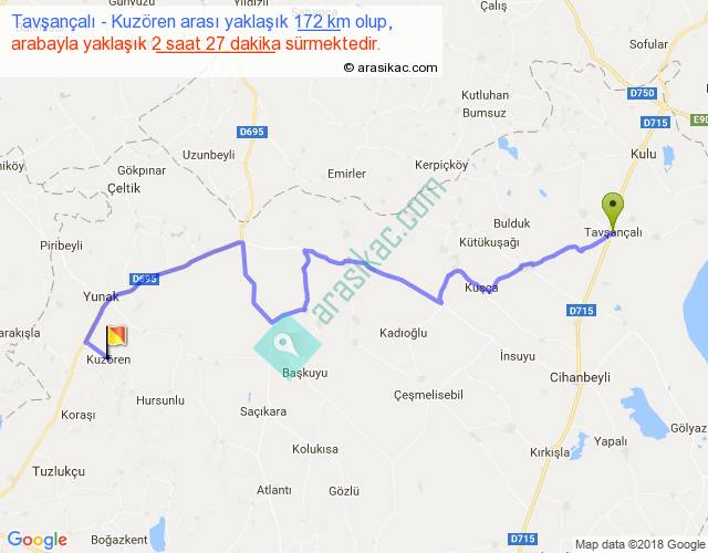 Tavşançalı - Kuzören arası yaklaşık olarak 90 km/h ile yukarıda belirtilen sürede olup, iki yerin kuş uçuşu uzaklığı (mesafesi) 111'dir. Yolculuk otobüsle 3 saat 11 dakika sürmektedir.