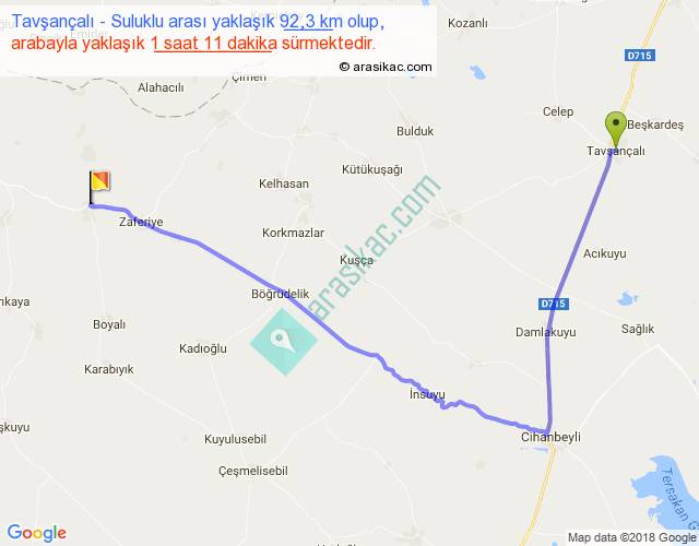 Tavşançalı - Suluklu arası yaklaşık olarak 90 km/h ile yukarıda belirtilen sürede olup, iki yerin kuş uçuşu uzaklığı (mesafesi) 57'dir. Yolculuk otobüsle 1 saat 32 dakika sürmektedir.