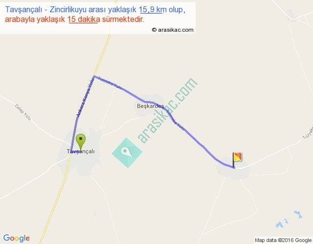 Tavşançalı - Zincirlikuyu arası yaklaşık olarak 90 km/h ile yukarıda belirtilen sürede olup, iki yerin kuş uçuşu uzaklığı (mesafesi) 9'dir. Yolculuk otobüsle 19 dakika sürmektedir.