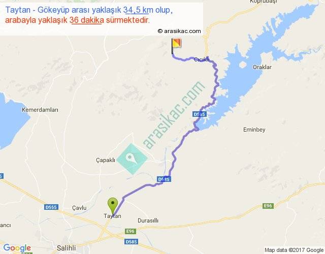 Taytan - Gökeyüp arası yaklaşık olarak 90 km/h ile yukarıda belirtilen sürede olup, iki yerin kuş uçuşu uzaklığı (mesafesi) 20'dir. Yolculuk otobüsle 46 dakika sürmektedir.
