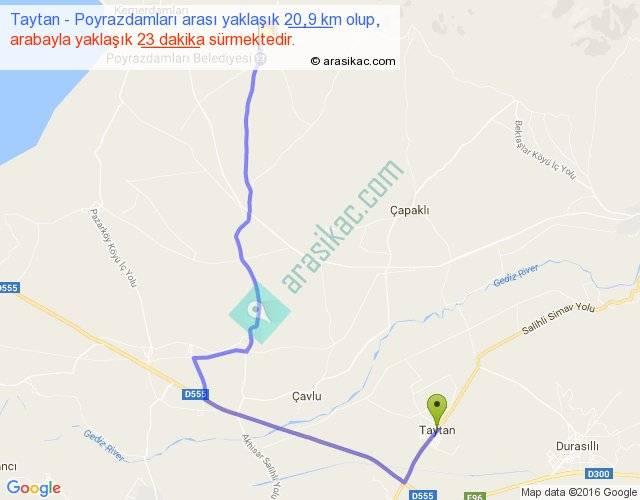 Taytan - Poyrazdamları arası yaklaşık olarak 90 km/h ile yukarıda belirtilen sürede olup, iki yerin kuş uçuşu uzaklığı (mesafesi) 12'dir. Yolculuk otobüsle 29 dakika sürmektedir.
