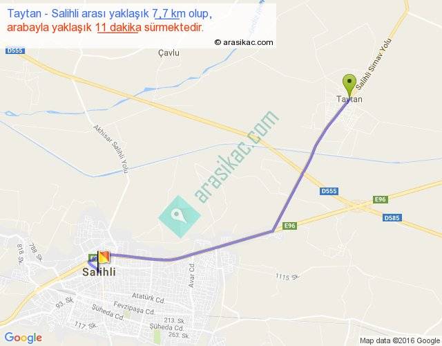 Taytan - Salihli arası yaklaşık olarak 90 km/h ile yukarıda belirtilen sürede olup, iki yerin kuş uçuşu uzaklığı (mesafesi) 7'dir. Yolculuk otobüsle 14 dakika sürmektedir.