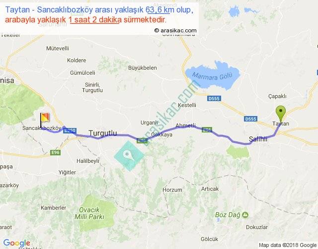 Taytan - Sancaklıbozköy arası yaklaşık olarak 90 km/h ile yukarıda belirtilen sürede olup, iki yerin kuş uçuşu uzaklığı (mesafesi) 57'dir. Yolculuk otobüsle 1 saat 20 dakika sürmektedir.
