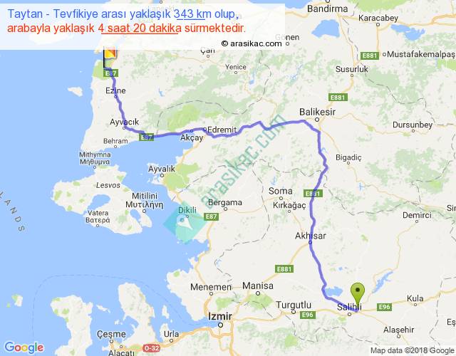 Taytan - Tevfikiye arası yaklaşık olarak 90 km/h ile yukarıda belirtilen sürede olup, iki yerin kuş uçuşu uzaklığı (mesafesi) 230'dir. Yolculuk otobüsle 5 saat 38 dakika sürmektedir.