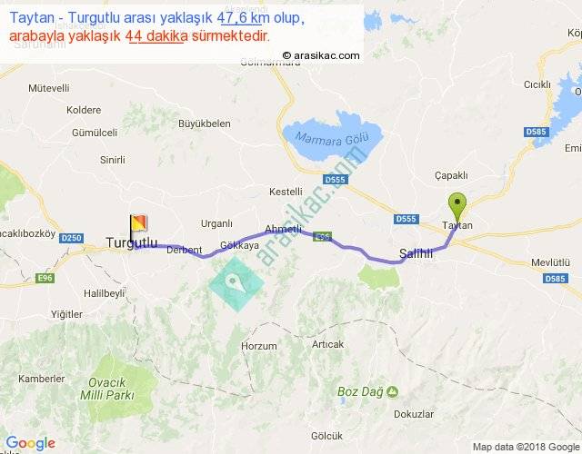 Taytan - Turgutlu arası yaklaşık olarak 90 km/h ile yukarıda belirtilen sürede olup, iki yerin kuş uçuşu uzaklığı (mesafesi) 43'dir. Yolculuk otobüsle 57 dakika sürmektedir.