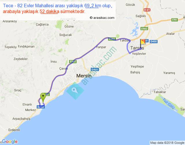 Tece - 82 Evler Mahallesi arası yaklaşık olarak 90 km/h ile yukarıda belirtilen sürede olup, iki yerin kuş uçuşu uzaklığı (mesafesi) 47'dir. Yolculuk otobüsle 1 saat 7 dakika sürmektedir.