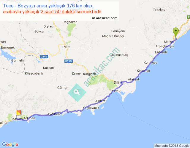 Tece - Bozyazı arası yaklaşık olarak 90 km/h ile yukarıda belirtilen sürede olup, iki yerin kuş uçuşu uzaklığı (mesafesi) 147'dir. Yolculuk otobüsle 3 saat 41 dakika sürmektedir.