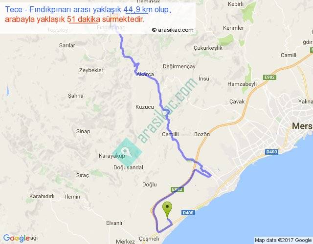 Tece - Fındıkpınarı arası yaklaşık olarak 90 km/h ile yukarıda belirtilen sürede olup, iki yerin kuş uçuşu uzaklığı (mesafesi) 25'dir. Yolculuk otobüsle 1 saat 6 dakika sürmektedir.