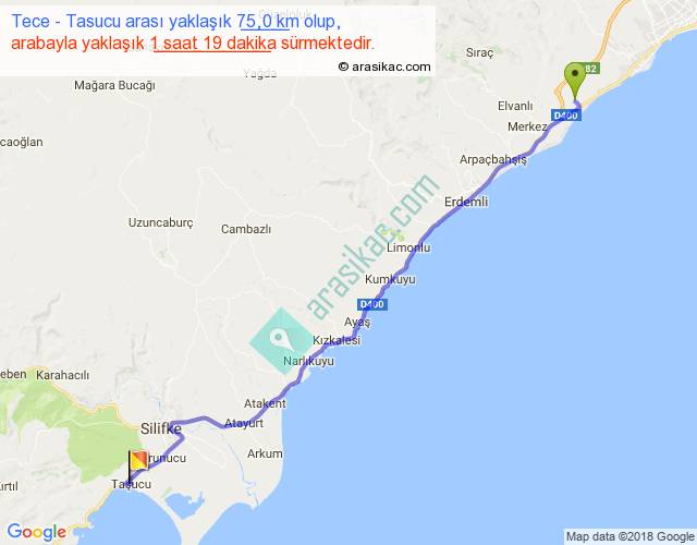Tece - Tasucu arası yaklaşık olarak 90 km/h ile yukarıda belirtilen sürede olup, iki yerin kuş uçuşu uzaklığı (mesafesi) 66'dir. Yolculuk otobüsle 1 saat 42 dakika sürmektedir.