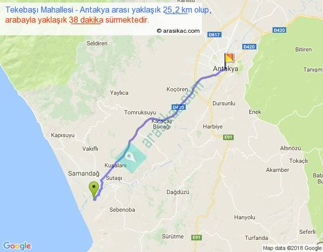 Tekebaşı Mahallesi - Antakya arası yaklaşık olarak 90 km/h ile yukarıda belirtilen sürede olup, iki yerin kuş uçuşu uzaklığı (mesafesi) 23'dir. Yolculuk otobüsle 49 dakika sürmektedir.