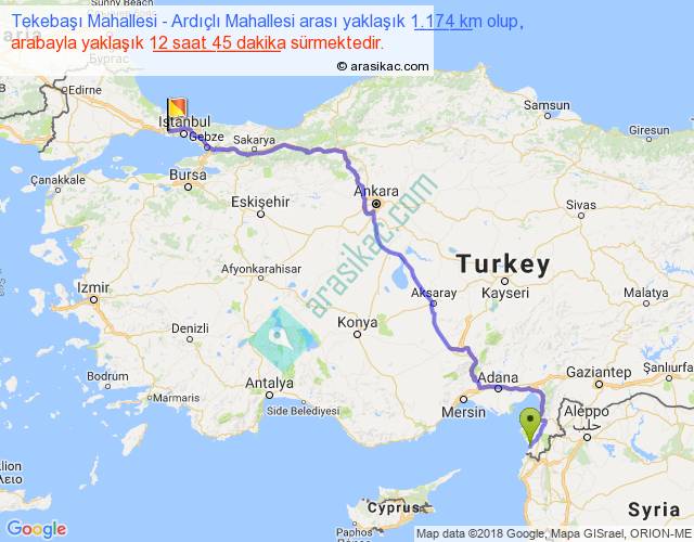 Tekebaşı Mahallesi - Ardıçlı Mahallesi arası yaklaşık olarak 90 km/h ile yukarıda belirtilen sürede olup, iki yerin kuş uçuşu uzaklığı (mesafesi) 838'dir. Eğer belirtilen yerler arasında uçak seferi var ise bu süre uçakla 1 saat 17 dakika'ya kadar düşebilir. Yolculuk otobüsle 16 saat 34 dakika sürmektedir.