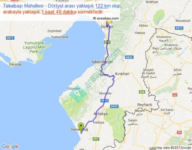 Tekebaşı Mahallesi - Dörtyol arası yaklaşık olarak 90 km/h ile yukarıda belirtilen sürede olup, iki yerin kuş uçuşu uzaklığı (mesafesi) 89'dir. Yolculuk otobüsle 2 saat 21 dakika sürmektedir.