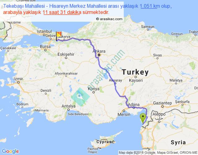 Tekebaşı Mahallesi - Hisareyn Merkez Mahallesi arası yaklaşık olarak 90 km/h ile yukarıda belirtilen sürede olup, iki yerin kuş uçuşu uzaklığı (mesafesi) 736'dir. Eğer belirtilen yerler arasında uçak seferi var ise bu süre uçakla 1 saat 07 dakika'ya kadar düşebilir. Yolculuk otobüsle 14 saat 58 dakika sürmektedir.