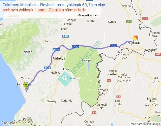 Tekebaşı Mahallesi - Reyhanlı arası yaklaşık olarak 90 km/h ile yukarıda belirtilen sürede olup, iki yerin kuş uçuşu uzaklığı (mesafesi) 57'dir. Yolculuk otobüsle 1 saat 33 dakika sürmektedir.
