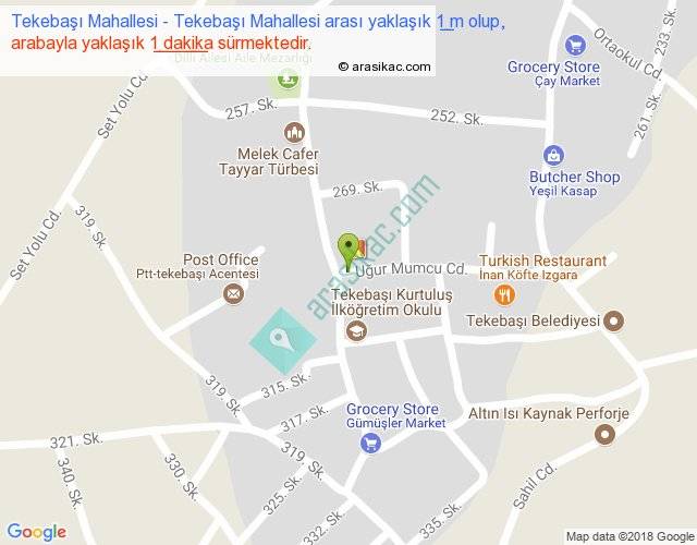 Tekebaşı Mahallesi - Tekebaşı Mahallesi arası yaklaşık olarak 90 km/h ile yukarıda belirtilen sürede olup, iki yerin kuş uçuşu uzaklığı (mesafesi) 0'dir. Yolculuk otobüsle 1 dakika sürmektedir.
