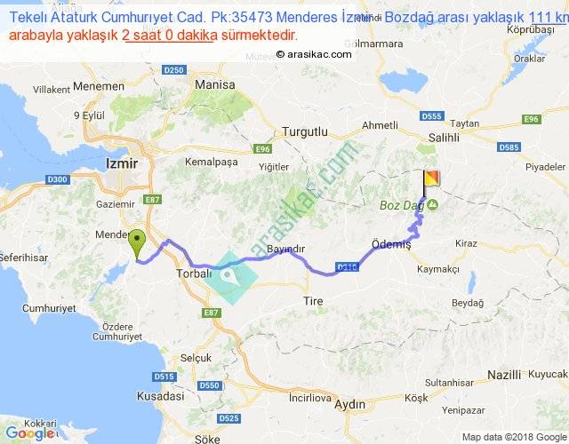 Tekelı Ataturk Cumhurıyet Cad. Pk:35473 Menderes İzmir - Bozdağ arası yaklaşık olarak 90 km/h ile yukarıda belirtilen sürede olup, iki yerin kuş uçuşu uzaklığı (mesafesi) 79'dir. Yolculuk otobüsle 2 saat 36 dakika sürmektedir.