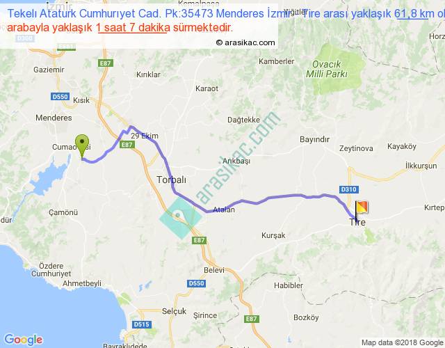 Tekelı Ataturk Cumhurıyet Cad. Pk:35473 Menderes İzmir - Tire arası yaklaşık olarak 90 km/h ile yukarıda belirtilen sürede olup, iki yerin kuş uçuşu uzaklığı (mesafesi) 48'dir. Yolculuk otobüsle 1 saat 27 dakika sürmektedir.