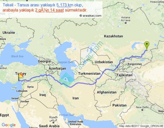 Tekeli - Tarsus arası yaklaşık olarak 90 km/h ile yukarıda belirtilen sürede olup, iki yerin kuş uçuşu uzaklığı (mesafesi) 3722'dir. Eğer belirtilen yerler arasında uçak seferi var ise bu süre uçakla 5 saat 43 dakika'ya kadar düşebilir. Yolculuk otobüsle 3 gün 8 saat sürmektedir.
