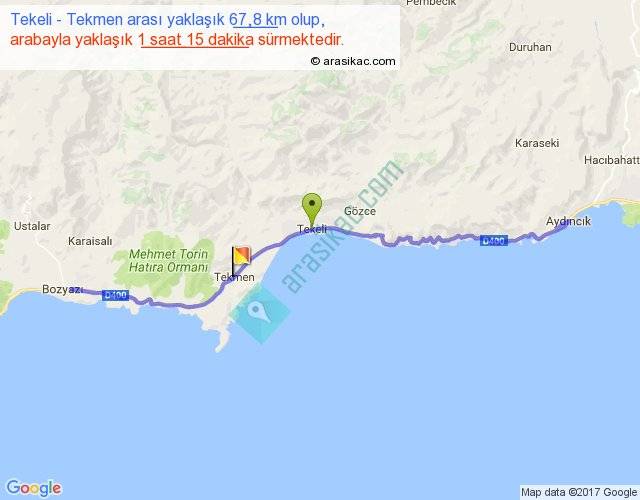 Tekeli - Tekmen arası yaklaşık olarak 90 km/h ile yukarıda belirtilen sürede olup, iki yerin kuş uçuşu uzaklığı (mesafesi) 6'dir. Yolculuk otobüsle 1 saat 37 dakika sürmektedir.