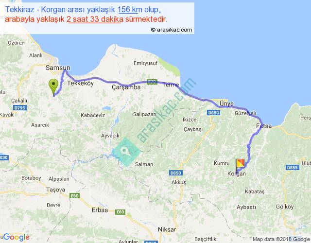 Tekkiraz - Korgan arası yaklaşık olarak 90 km/h ile yukarıda belirtilen sürede olup, iki yerin kuş uçuşu uzaklığı (mesafesi) 94'dir. Yolculuk otobüsle 3 saat 18 dakika sürmektedir.
