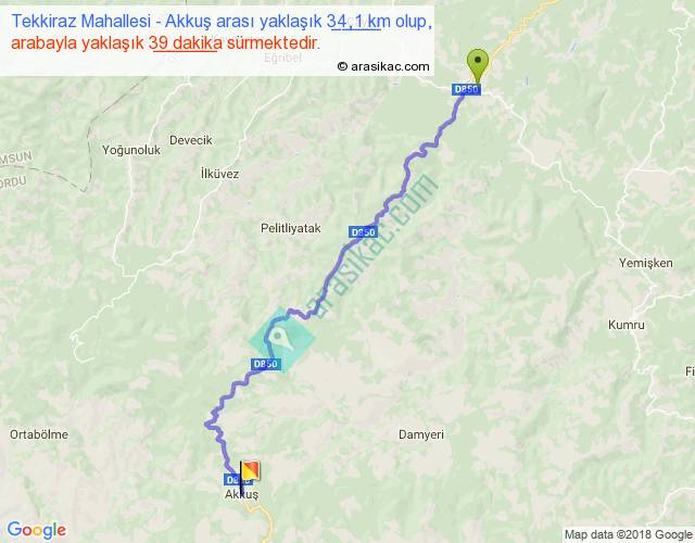 Tekkiraz Mahallesi - Akkuş arası yaklaşık olarak 90 km/h ile yukarıda belirtilen sürede olup, iki yerin kuş uçuşu uzaklığı (mesafesi) 25'dir. Yolculuk otobüsle 50 dakika sürmektedir.