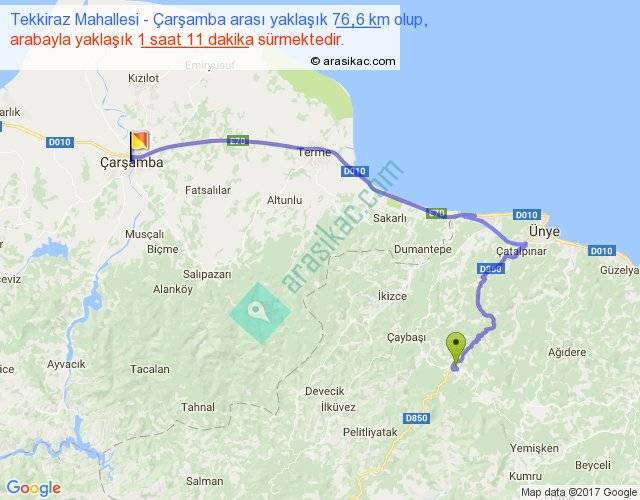 Tekkiraz Mahallesi - Çarşamba arası yaklaşık olarak 90 km/h ile yukarıda belirtilen sürede olup, iki yerin kuş uçuşu uzaklığı (mesafesi) 44'dir. Yolculuk otobüsle 1 saat 32 dakika sürmektedir.