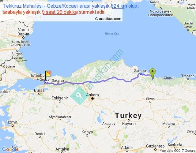 Tekkiraz Mahallesi - Gebze Kocaeli arası yaklaşık olarak 90 km/h ile yukarıda belirtilen sürede olup, iki yerin kuş uçuşu uzaklığı (mesafesi) 637'dir. Eğer belirtilen yerler arasında uçak seferi var ise bu süre uçakla 58 dakika'ya kadar düşebilir. Yolculuk otobüsle 12 saat 19 dakika sürmektedir.