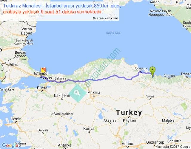 Tekkiraz Mahallesi - İstanbul arası yaklaşık olarak 90 km/h ile yukarıda belirtilen sürede olup, iki yerin kuş uçuşu uzaklığı (mesafesi) 683'dir. Eğer belirtilen yerler arasında uçak seferi var ise bu süre uçakla 1 saat 03 dakika'ya kadar düşebilir. Yolculuk otobüsle 12 saat 48 dakika sürmektedir.