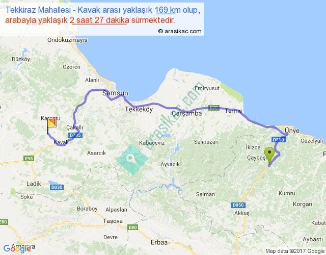 Tekkiraz Mahallesi - Kavak arası yaklaşık olarak 90 km/h ile yukarıda belirtilen sürede olup, iki yerin kuş uçuşu uzaklığı (mesafesi) 101'dir. Yolculuk otobüsle 3 saat 11 dakika sürmektedir.