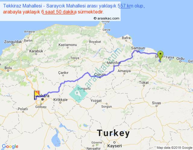 Tekkiraz Mahallesi - Saraycık Mahallesi arası yaklaşık olarak 90 km/h ile yukarıda belirtilen sürede olup, iki yerin kuş uçuşu uzaklığı (mesafesi) 403'dir. Eğer belirtilen yerler arasında uçak seferi var ise bu süre uçakla 37 dakika'ya kadar düşebilir. Yolculuk otobüsle 8 saat 53 dakika sürmektedir.