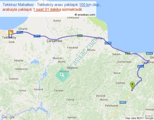 Tekkiraz Mahallesi - Tekkeköy arası yaklaşık olarak 90 km/h ile yukarıda belirtilen sürede olup, iki yerin kuş uçuşu uzaklığı (mesafesi) 64'dir. Yolculuk otobüsle 1 saat 58 dakika sürmektedir.