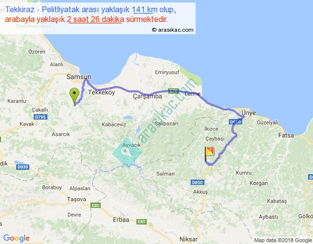 Tekkiraz - Pelitliyatak arası yaklaşık olarak 90 km/h ile yukarıda belirtilen sürede olup, iki yerin kuş uçuşu uzaklığı (mesafesi) 67'dir. Yolculuk otobüsle 3 saat 9 dakika sürmektedir.