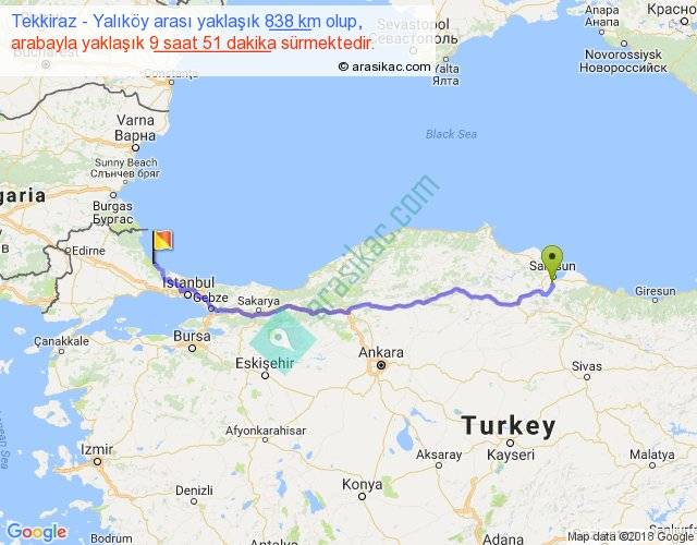 Tekkiraz - Yalıköy arası yaklaşık olarak 90 km/h ile yukarıda belirtilen sürede olup, iki yerin kuş uçuşu uzaklığı (mesafesi) 666'dir. Eğer belirtilen yerler arasında uçak seferi var ise bu süre uçakla 1 saat 01 dakika'ya kadar düşebilir. Yolculuk otobüsle 12 saat 48 dakika sürmektedir.