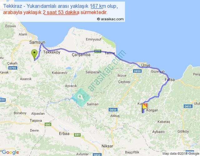 Tekkiraz - Yukarıdamlalı arası yaklaşık olarak 90 km/h ile yukarıda belirtilen sürede olup, iki yerin kuş uçuşu uzaklığı (mesafesi) 88'dir. Yolculuk otobüsle 3 saat 44 dakika sürmektedir.
