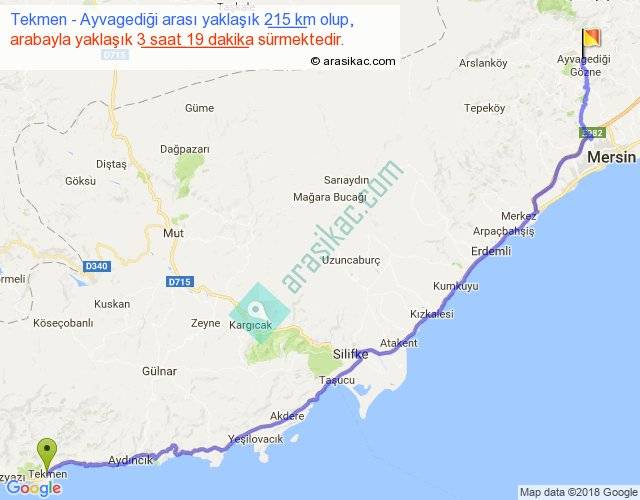 Tekmen - Ayvagediği arası yaklaşık olarak 90 km/h ile yukarıda belirtilen sürede olup, iki yerin kuş uçuşu uzaklığı (mesafesi) 165'dir. Yolculuk otobüsle 4 saat 18 dakika sürmektedir.