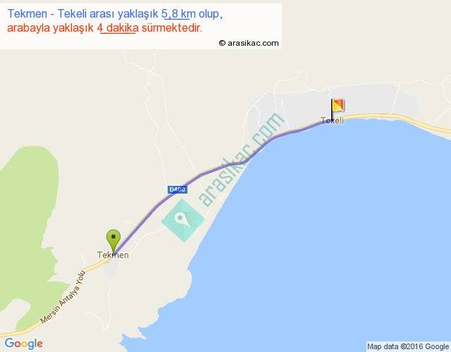 Tekmen - Tekeli arası yaklaşık olarak 90 km/h ile yukarıda belirtilen sürede olup, iki yerin kuş uçuşu uzaklığı (mesafesi) 6'dir. Yolculuk otobüsle 5 dakika sürmektedir.