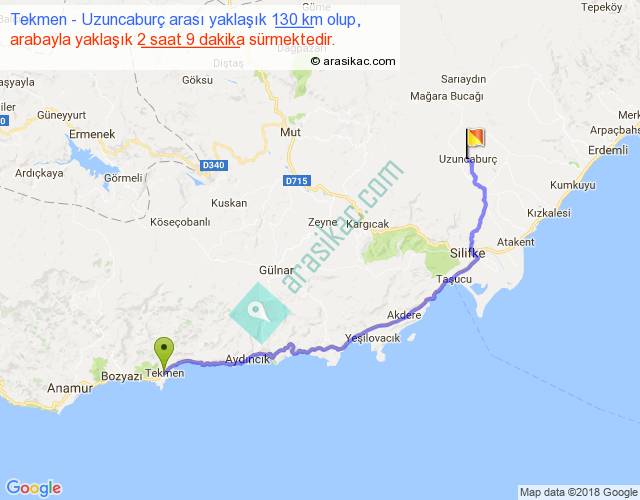 Tekmen - Uzuncaburç arası yaklaşık olarak 90 km/h ile yukarıda belirtilen sürede olup, iki yerin kuş uçuşu uzaklığı (mesafesi) 91'dir. Yolculuk otobüsle 2 saat 47 dakika sürmektedir.