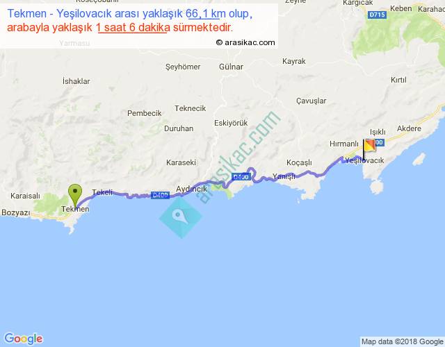 Tekmen - Yeşilovacık arası yaklaşık olarak 90 km/h ile yukarıda belirtilen sürede olup, iki yerin kuş uçuşu uzaklığı (mesafesi) 52'dir. Yolculuk otobüsle 1 saat 25 dakika sürmektedir.