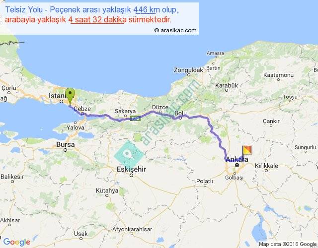 Telsiz Yolu - Peçenek arası yaklaşık olarak 90 km/h ile yukarıda belirtilen sürede olup, iki yerin kuş uçuşu uzaklığı (mesafesi) 338'dir. Eğer belirtilen yerler arasında uçak seferi var ise bu süre uçakla 31 dakika'ya kadar düşebilir. Yolculuk otobüsle 5 saat 53 dakika sürmektedir.